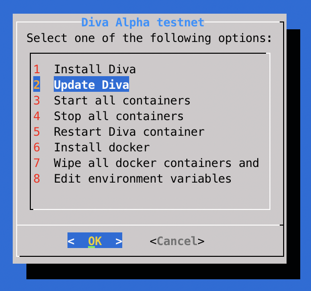 inside the diva-alpha-net folder, and select option 2. Update Diva: